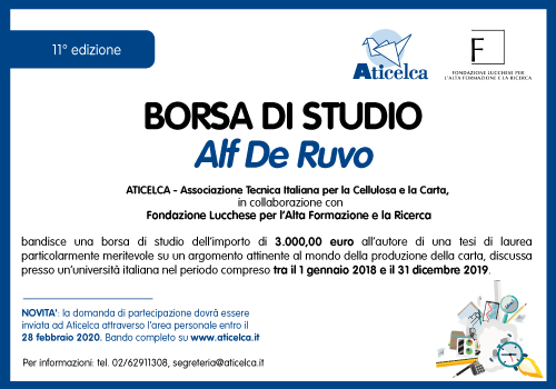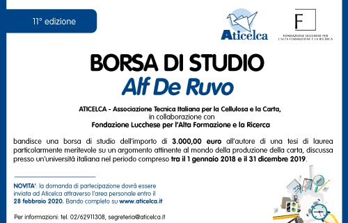 Vi ricordiamo che Aticelca, in collaborazione con Fondazione Lucchese per l’Alta Formazione e la Ricerca bandisce una borsa di studio dell’importo di 3.000 euro da assegnare all’autore di una tesi di laurea particolarmente meritevole su un argomento attinente al mondo della produzione della carta, discussa presso un’università italiana nel periodo compreso tra il 1° gennaio 2018 e il 31 dicembre 2019.