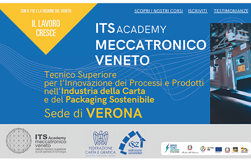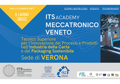 La Fondazione Meccatronico Veneto ha aperto le iscrizioni ai propri corsi ITS, tra i quali il corso ITS ideato per la filiera della carta e della cartotecnica, e avviato lo scorso anno presso la sede dell’Istituto Salesiano San Zeno di Verona. Il progetto ha l’obiettivo di formare tecnici specializzati da inserire in tempi molto rapidi nel processo produttivo, grazie al diretto coinvolgimento delle aziende nel percorso formativo, ed è sostenuto dalla Federazione Carta e Grafica che ha aderito alla Fondazione come socio fondatore diventandone un componente del Consiglio di indirizzo.